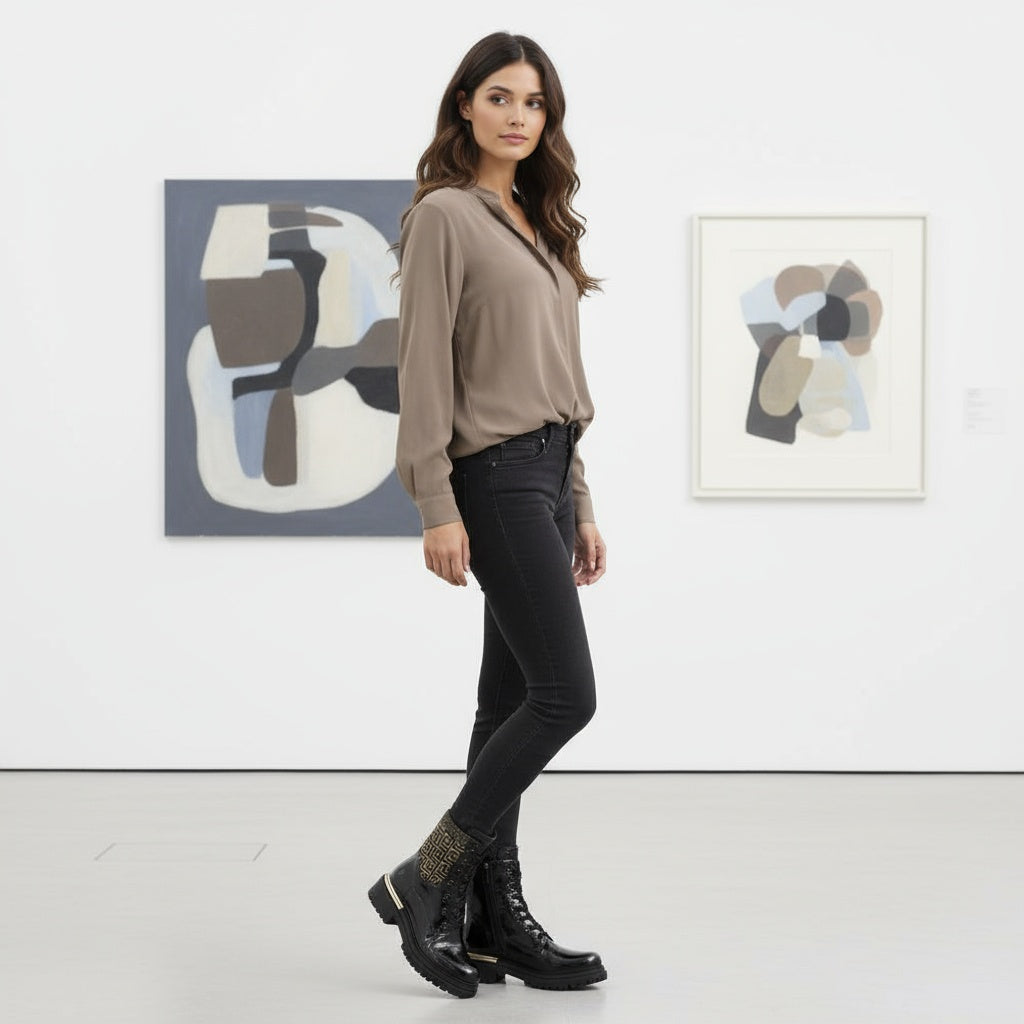 These stunning black boots feature a crinkle patent design with eye-catching gold details on the heel and a geometric pattern on the leg. Laced but also equipped with an inside zip, these boots not only offer a stylish look but also provide comfort without the hassle of breaking them in. Say goodbye to painful new shoes - these boots are ready to wear right out of the box!