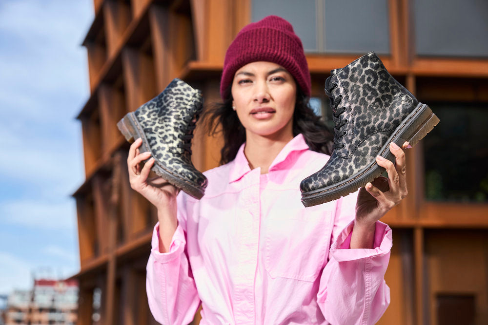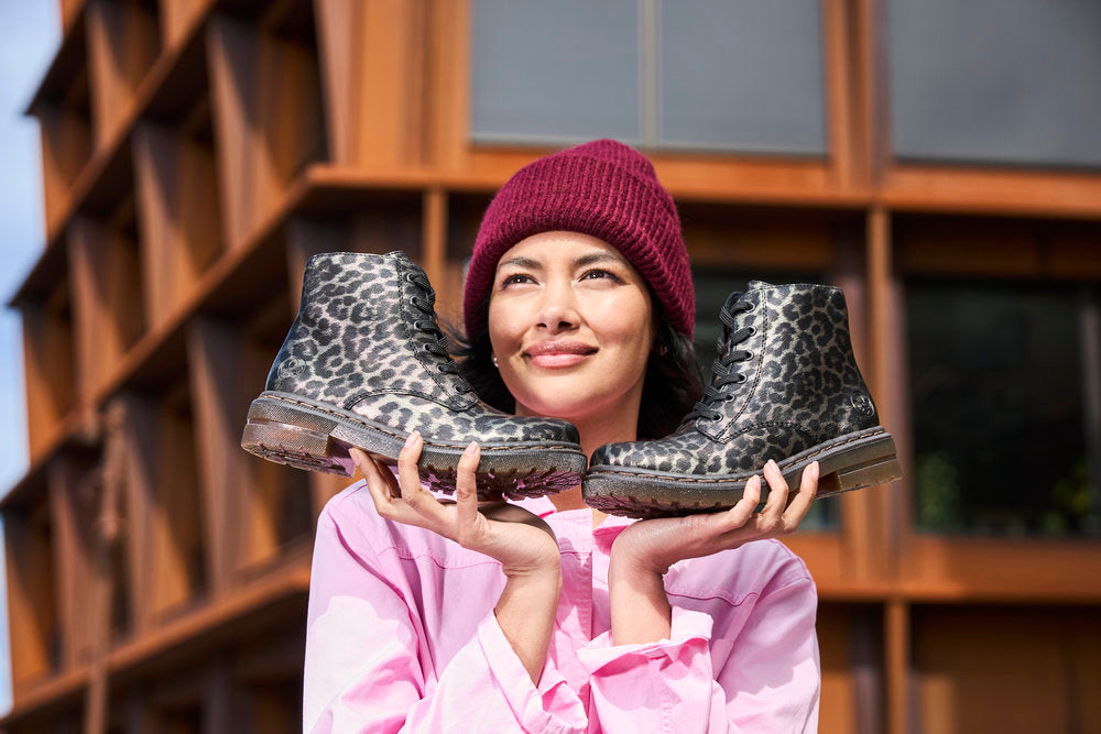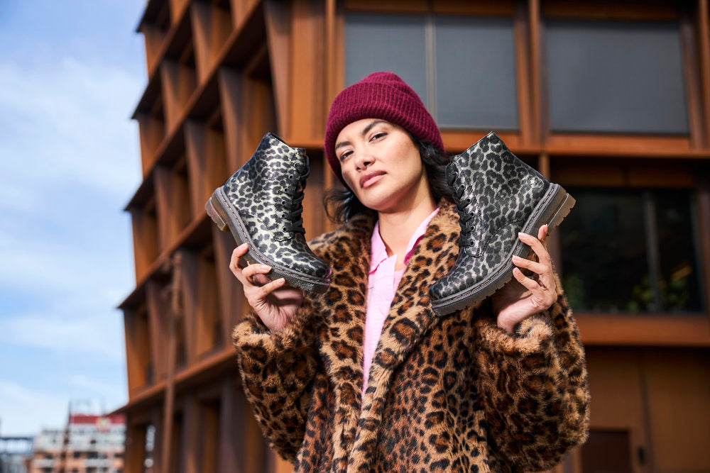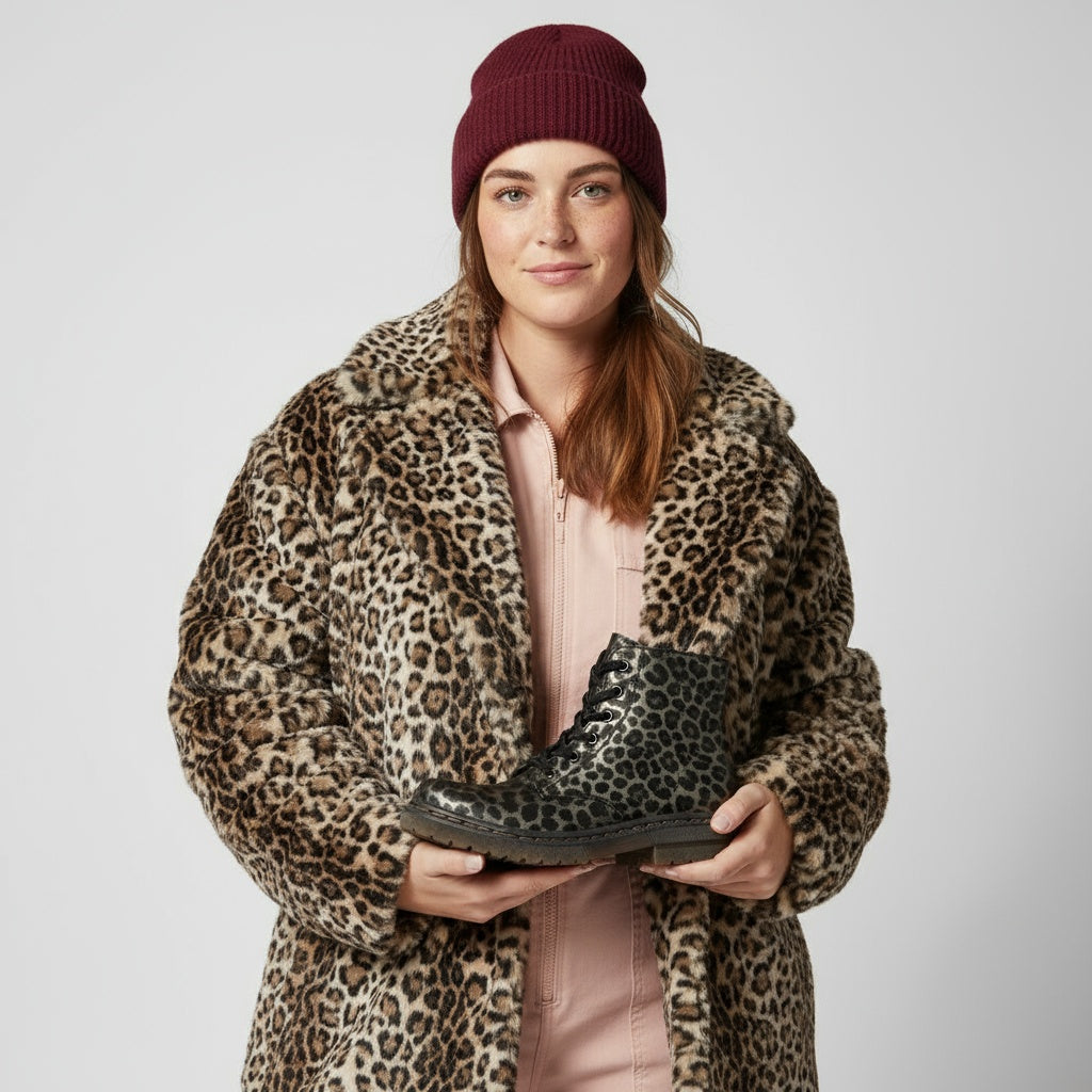 Step out in style with these Ladies Rieker Boots featuring a bold animal print that adds a fun twist to any outfit. Designed for comfort right out of the box, they boast a chunky sole with eye-catching side stitching detail. The black and bronze uppers create a unique look, finished with a subtle logo embossed on the heel. Perfect for those who love playful yet practical footwear!