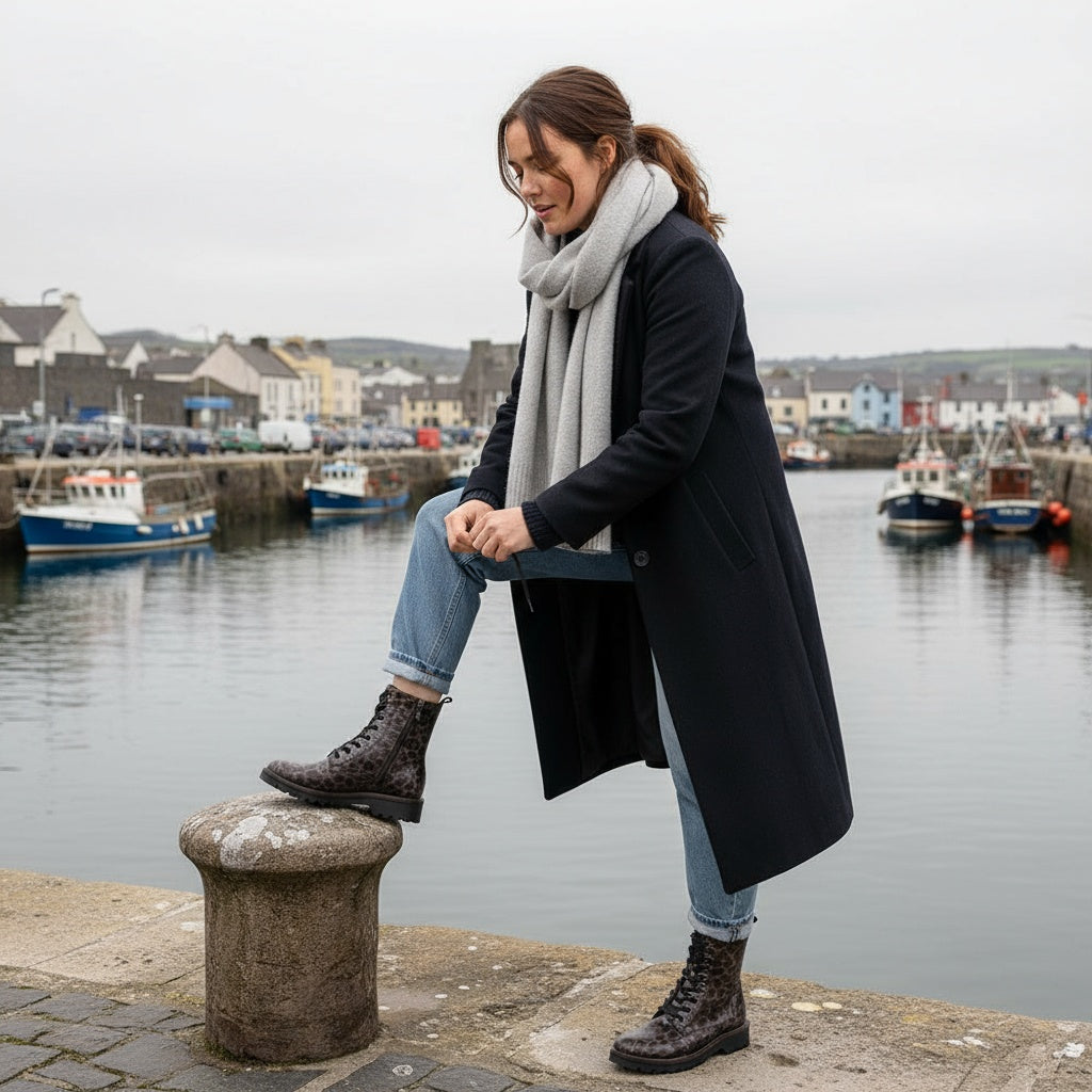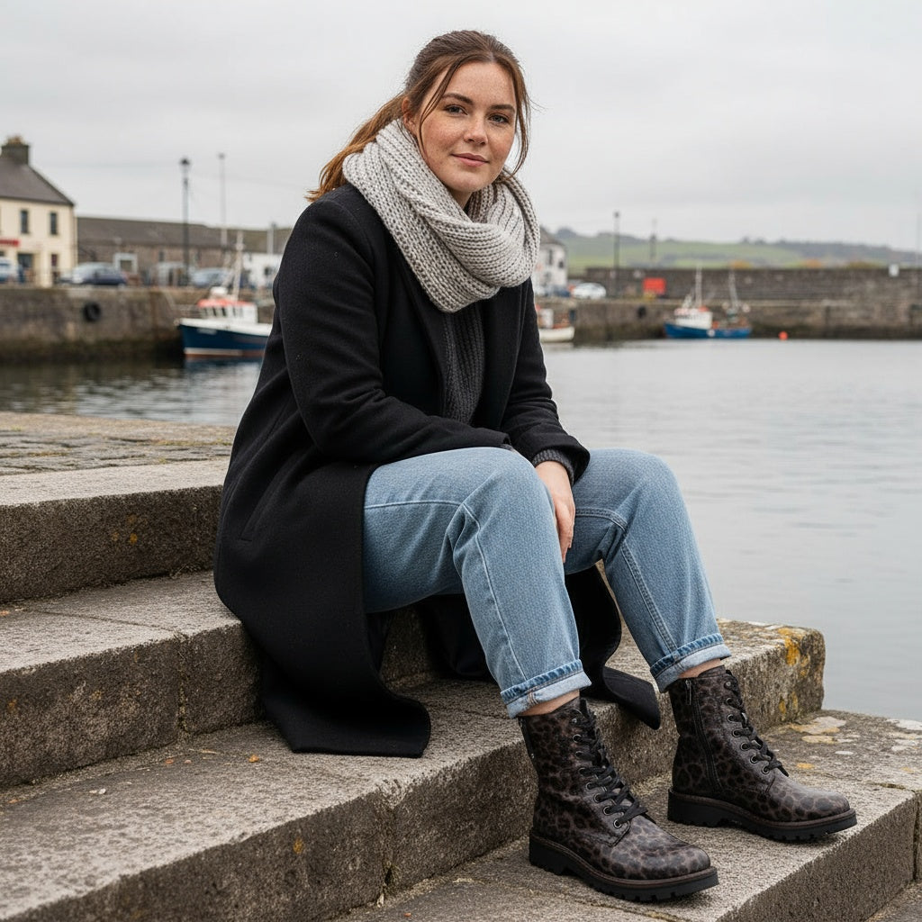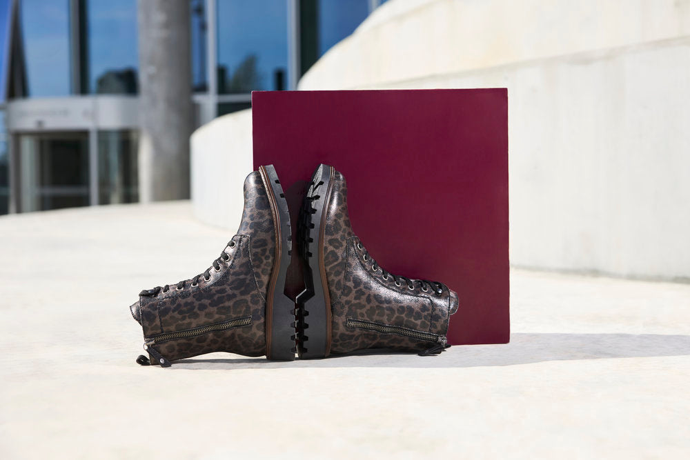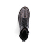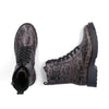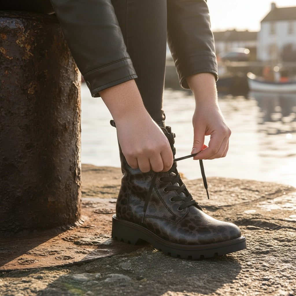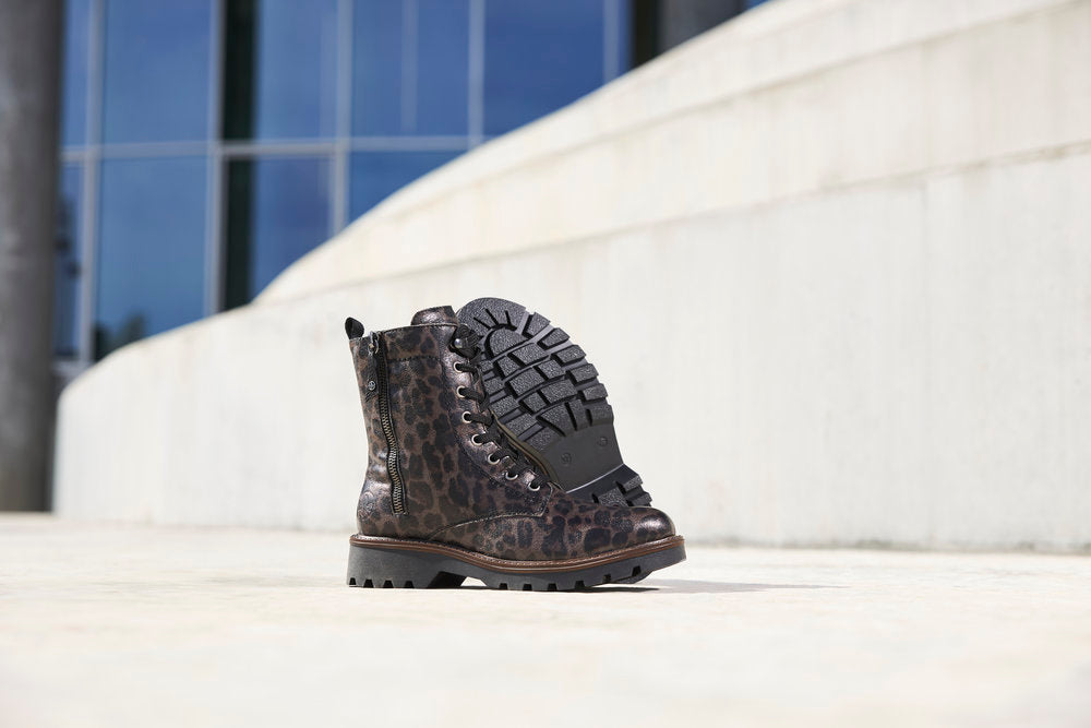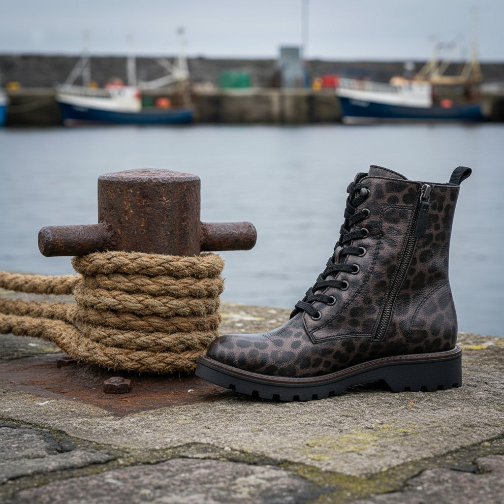 Step out in style with these Ladies Rieker Boots featuring a bold animal print that adds a fun twist to any outfit. Designed for comfort right out of the box, they boast a chunky sole with eye-catching side stitching detail. The black and bronze uppers create a unique look, finished with a subtle logo embossed on the heel. Perfect for those who love playful yet practical footwear!